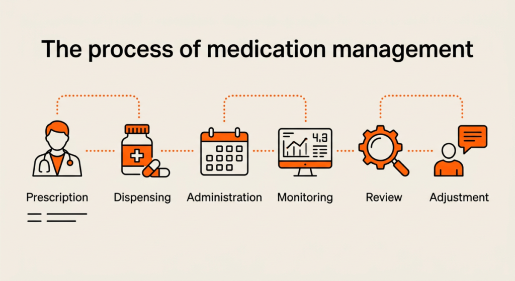 Medication management is the process of choosing the right medication, taking it correctly, and regularly reviewing it with a healthcare provider to ensure it works safely and effectively.